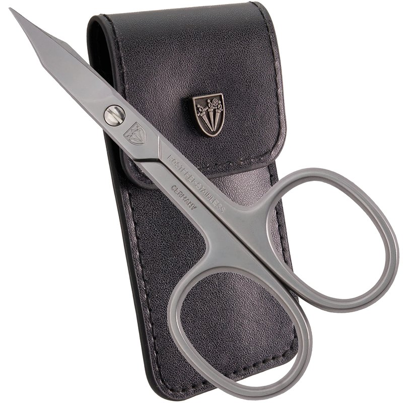 - POUCH For safe and hygienic storage, the scissors come in a high-quality faux leather pouch. The pouch is easy to keep closed with a snap fastener and can be conveniently stowed in handbags or toiletry bags.