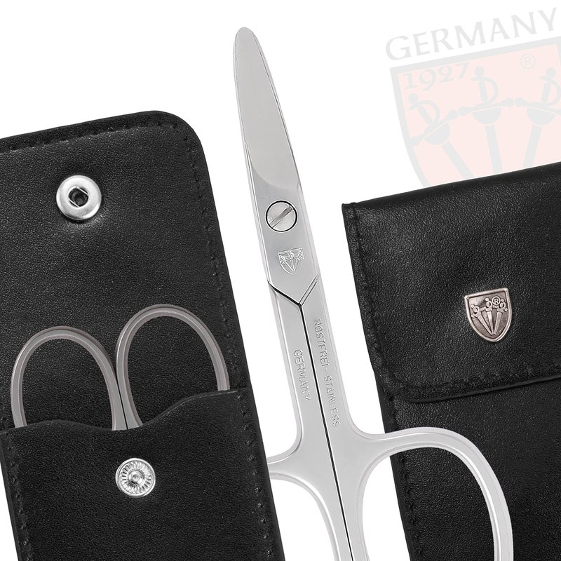 - POUCH For safe and hygienic storage, the scissors come in a high-quality faux leather pouch. The pouch is easy to keep closed with a snap fastener and can be conveniently stowed in handbags or toiletry bags.