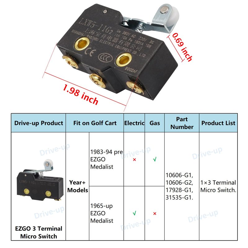 3 Terminal EZGO Micro Switch for EZGO TXT Golf Cart Marathon Switch with Roller OEM 10606-G1 10606-G2 17928-G1 31535-G1