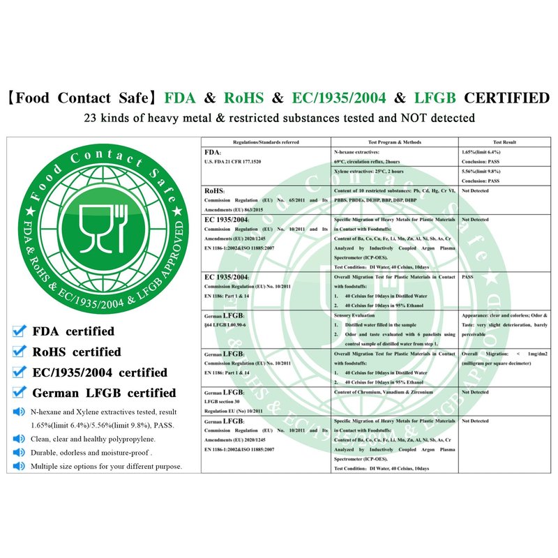 - Food contact safe: FDA & RoHS & EC/1935/2004 & German LFGB certified, made of new polypropylene material (OPP), please feel free to use. 23 kinds of heavy metal/restricted substances tested and NOT detected. N-hexane and Xylene extractives tested, result 1.65%(limit 6.4%)/5.56%(limit 9.8%).