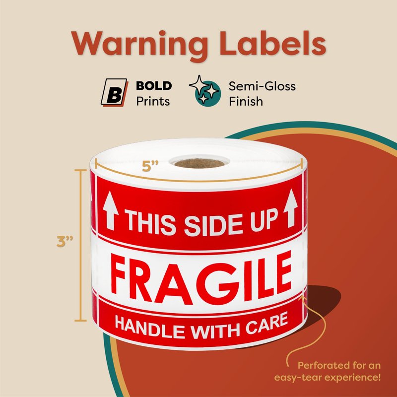 "“This Side Up – Handle With Care” Labels. High-Resolution, Vibrant-Red, Semi-Gloss, Premium Pre-Printed Stock Labels. 3" X 5" Label for larger Packages, Mailers, and Envelopes; 500 Labels/Roll. Powerful Adhesive that sticks to virtually any surface for a permanent hold. Provide eye-catching, professional shipping & handling instructions, messages, graphics to ensure the safe arrival of your important, fragile shipments.