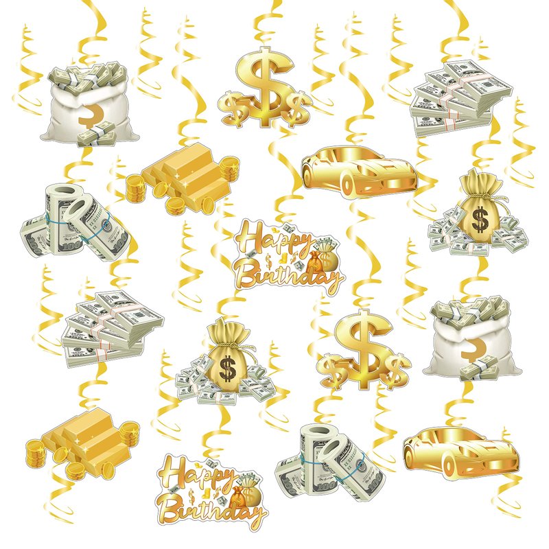 - You will get 1 pack(already assembled) MONEY party hanging swirls(30pcs included,16 with cutouts and the other 14 plain gold swirls)