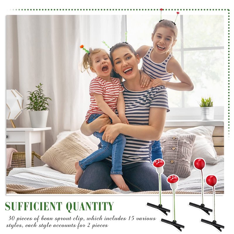 - Novelty Designs: the package includes 30 pieces of bean sprout clip, which includes 15 various styles, each style accounts for 2 pieces, there are bean sprouts, clovers, small red flowers, sunflowers, fruits, and so on