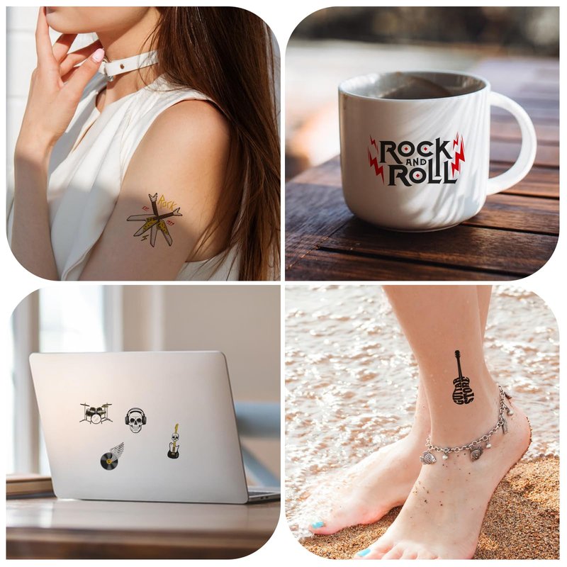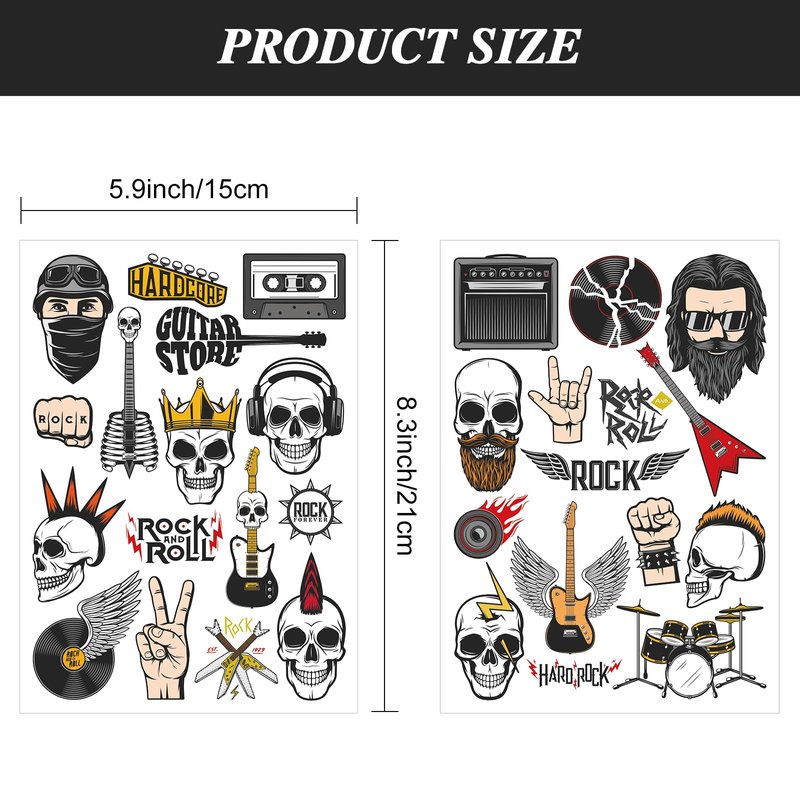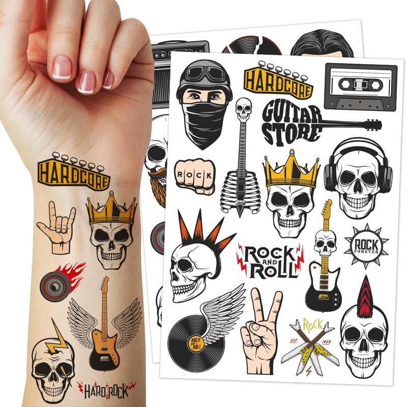 - Rock and Roll Temporary Tattoos: Punk rock themed temporary tattoos stickers features an assortment of rock elements, vinyl record, skull, guitar, drum set, microphone. Various rock and other cool styles patterns will make your party very memorable.