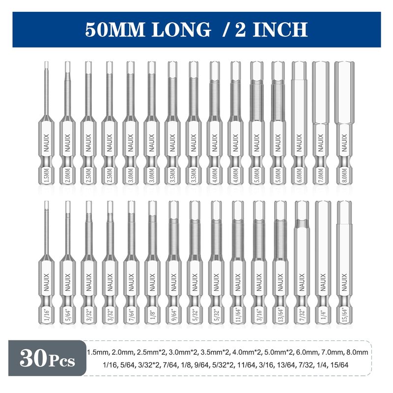- ▲ 【Metric and SAE S2 Steel Hex Bits Set】[METRIC]:15 Pack Metric hex bits, Sizes - 1.5mm, 2.0mm, 2.5mm, 2.5mm, 3.0mm, 3.0mm, 3.5mm, 3.5mm, 4.0mm, 4.0mm, 5.0mm, 5.0mm, 6.0mm, 7.0mm, 8.0mm. [SAE]:15 Pack SAE hex bits, Sizes - 1/16", 5/64", 3/32", 3/32", 7/64", 1/8", 9/64", 5/32", 5/32", 11/64", 3/16", 13/64", 7/32", 15/64", 1/4".