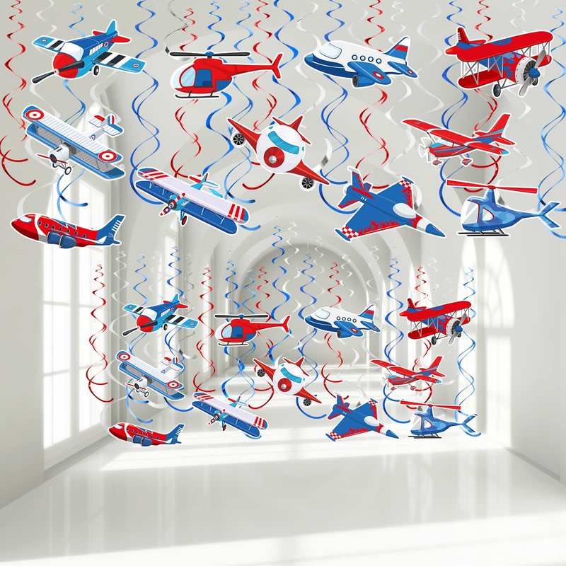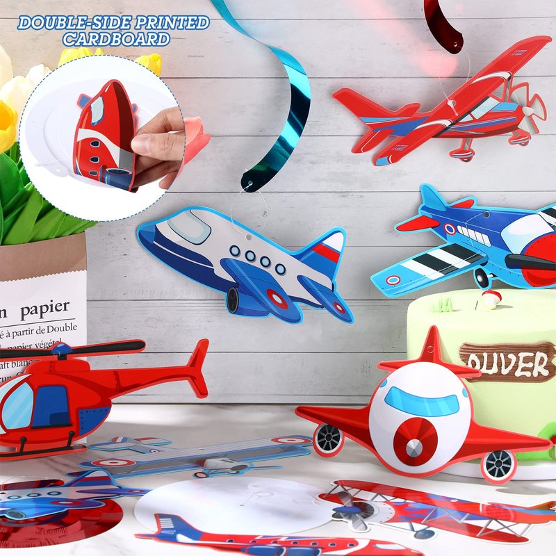 - Cute Airplane Design: the airplane party supplies set are designed with 11 different styles of airplanes, features vibrant color and double sided printing; After these aircraft models cutouts are suspended by spirals, they will float in the air like real planes, colorful and vivid; You can also use the airplane ceiling hanging swirls as shiny decoration props to take photos, satisfy children's aerospace dreams
