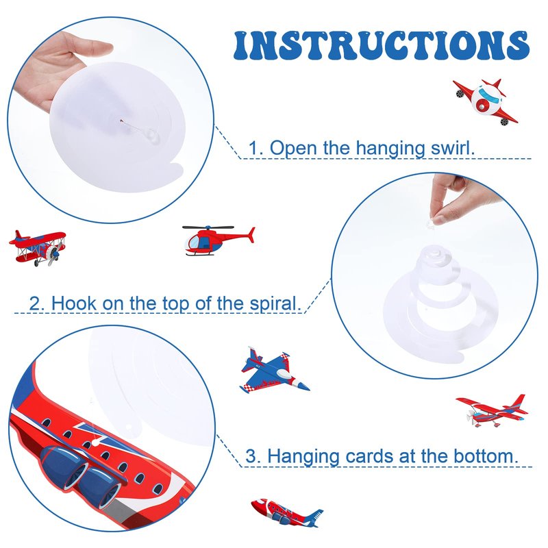 - Easy to Assemble: the airplane foil swirls can be directly hung anywhere you want with the hook on the top, such as ceiling, door, windows, tree branches, you just need to link the shiny color party spirals and the card with a hook, you can also match with other airplane ornaments to create a completely cute and active party atmosphere