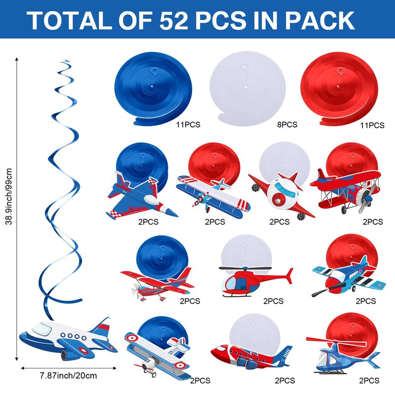 - Package Includes: the airplane hanging decorations set includes 22 pieces airplane paper cutouts, 22 pieces single tailed spirals in 3 different colors (8 blue, 8 red, 8 white), 8 pieces double tailed spirals(3 blue, 3 red, 2 white), each vortex can extend to approximately 32-40 inches long, sufficient quantity and cute design to meet your airplane party needs