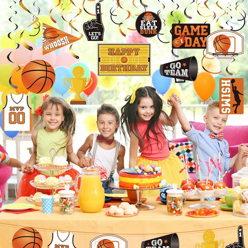- Basketball birthday party design: the basketball party foil swirl decorations kit uses three classic colors of black orange white with ample patterns printed on both sides; Featuring cutouts of the basketball jersey, basketball, trophy, finger and basketball hoop; If you are looking for basketball birthday party ideas or any basketball-themed competition party gifts for kids, teenagers, friends, and basketball fans, you should not miss these hanging swirls