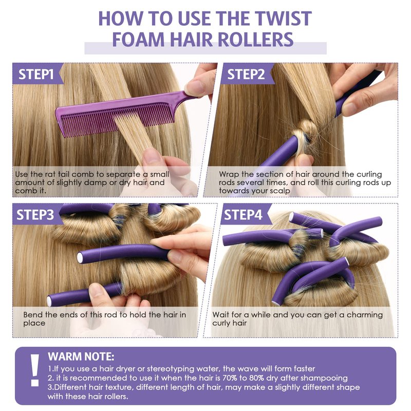 30 Pieces Flexible Curling Rods Twist Foam Hair Rollers Soft Foam No Heat Hair Rods Rollers and 1 Steel Pintail Comb Rat Tail Comb for Women Girls Long and Short Hair (Purple, 9.45 x 0.47 Inch)