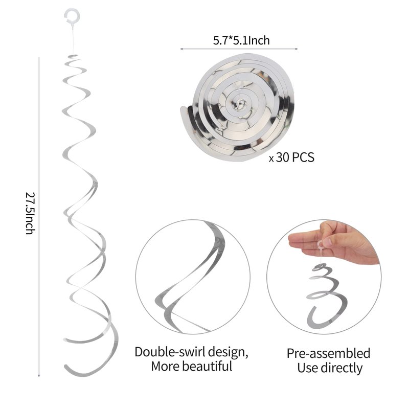 - 【Multi Usage】These silver swirl decorations can be hung from the ceiling, window, mantel, overhangs, doorway, archway, branches in trees or used as unique table centerpieces. Perfect for birthday party, baby shower, anniversary, wedding, holiday party, Graduation and other theme party.