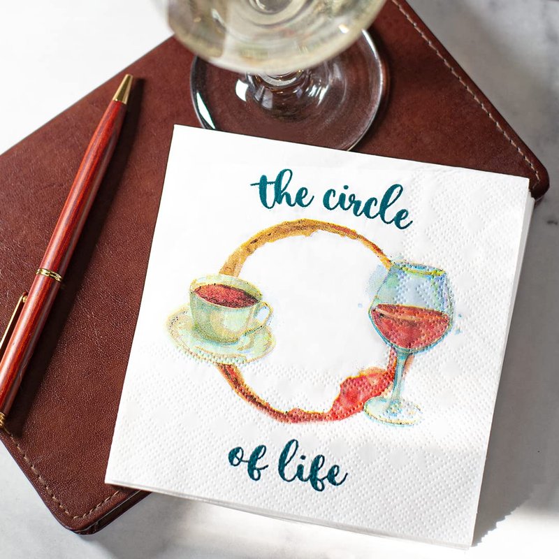 - INCLUDES: 30 pack of charming Coffee to Wine is "The Circle of Life" Beverage Napkins that measure 4.9 x 4.9 inches folded, 9.8 x 9.8 inches unfolded. Disposable and recycleable.