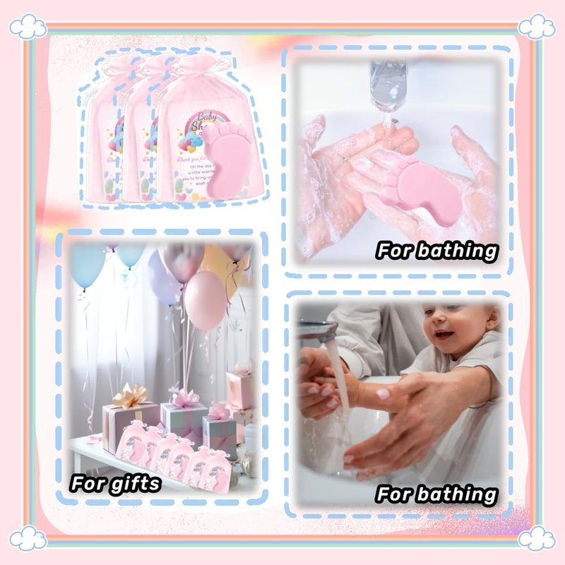 - Baby soap displays an enchanting feet pattern, celebrating the joyous anticipation of tiny toes; This ingenious design adds a playful, creative touch to your baby shower, an interesting conversation starter, and an irresistible charm to your overall event decor