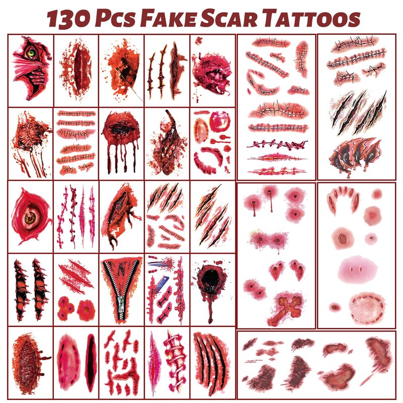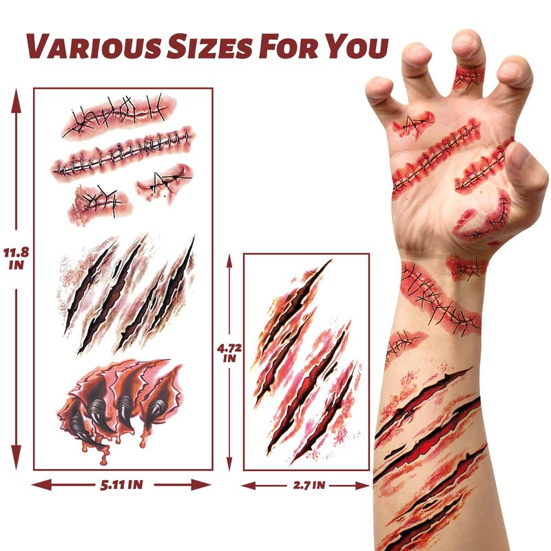 - Pretty Realistic Makeup tattoos: Halloween zombie makeup set including fake cuts, fake wounds, wolf scratches, vampire bites and other fake scars, designs are pretty realistic, like real wounds, bloody and scary. Used at cosplay, Halloween makeup, Zombie Makeup, masquerade and Halloween party.