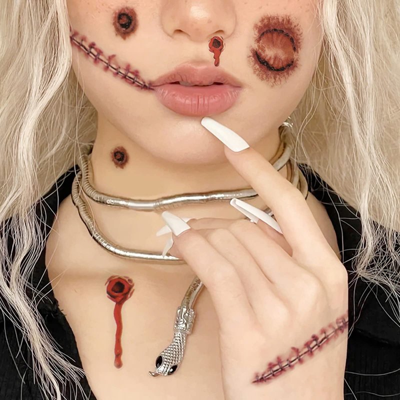 - 【Wide Application】: Bloody Halloween tattoos can be applied to the skin of the face, hands, arms, shoulders, chest or legs. Fake wound stitches, tribal patterns, spiders, scratches, bites and bullet holes for adults and kids, specially designed for Halloween parties. Realistic tattoos for adult Halloween makeup kits, makeup, Chucky makeup kits, decorations, Halloween costumes, festivals, festivals, carnival accessories, bachelorette parties.
