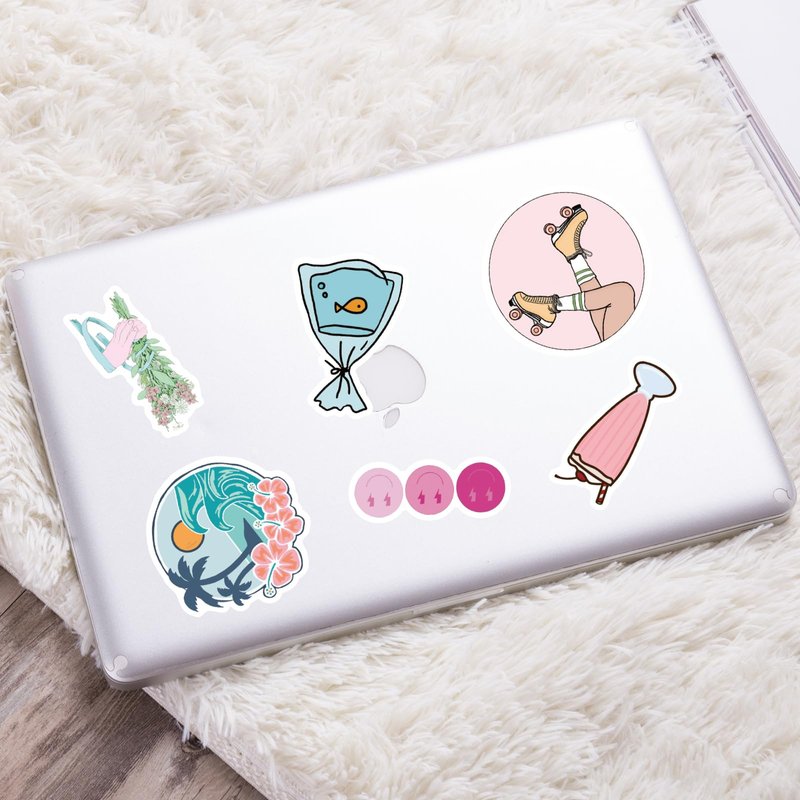 - VSCO Aesthetic Artistic Stickers Pack: This artistic set of decals includes only one of each design and features a variety of nature-inspired images from plants and flowers to animals and rainbows. Adorn and embellish keyboards, phones, mirrors, bulletin boards, guitars, greeting cards, skateboards and so much more!