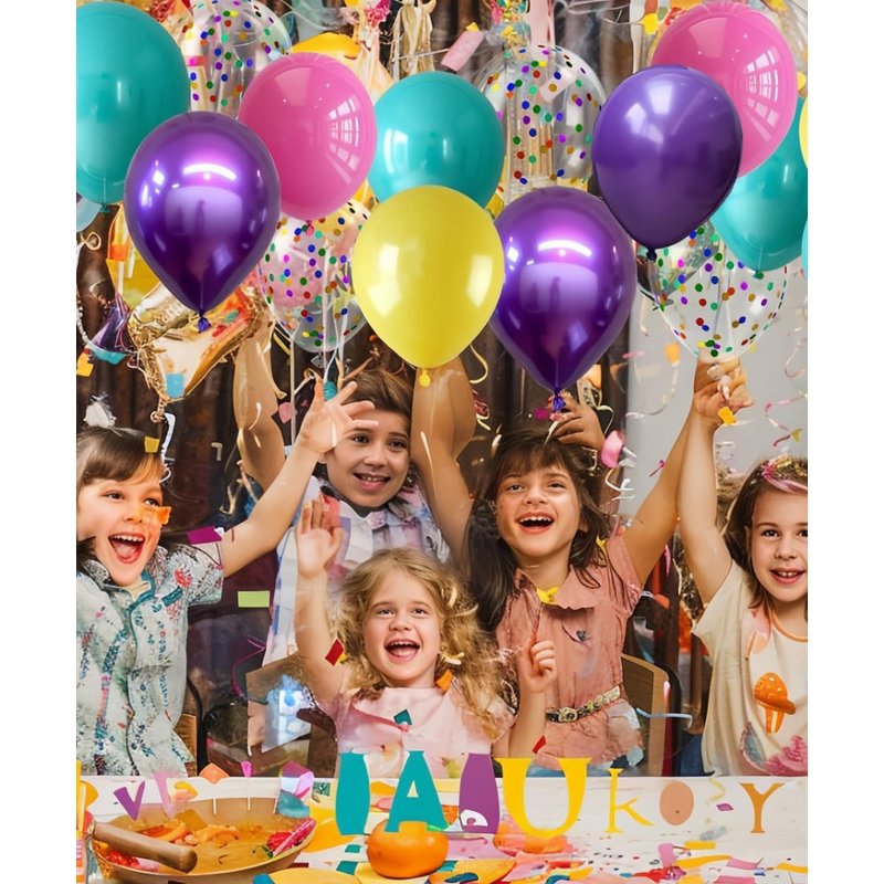 • Vibrant Balloon Set: This 300-piece set, 50 of each color, includes 12-inch purple latex balloons purple metallic, , teal, hot pink, yellow and Confetti Balloons