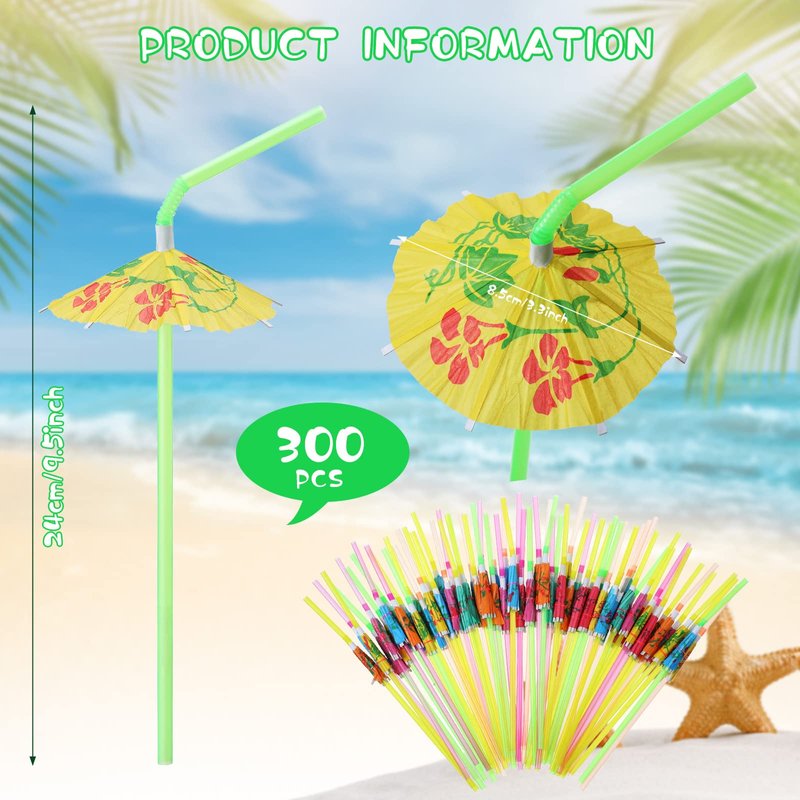 - What You Will Get: the package has 300 pieces of plastic straw luau party decorations, straws and umbrellas are randomly matched with various colors; Luau straws are fluorescent color, and the umbrellas have different patterns, exquisite and beautiful to meet your decorative needs