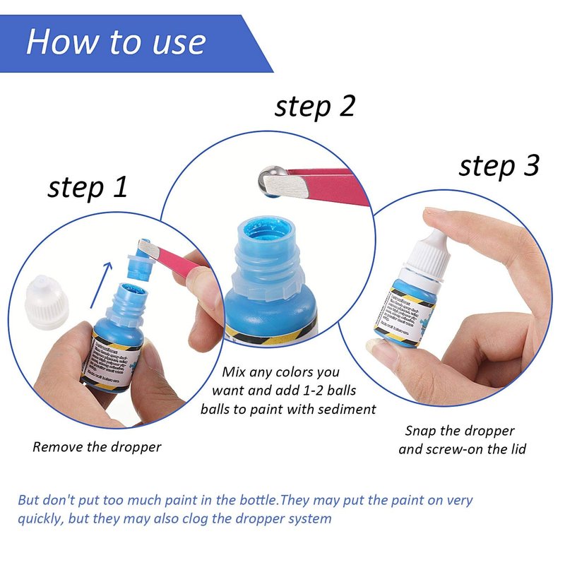 - Simple operation: simply open the lid and carefully pour the paint or nail polish into the bottle, then add 1 - 2 or 2 - 3 mixing agitator balls, and screw-on the lid, now you can shake the bottle to mix the paint or nail polish together, and enjoy the process of DIY