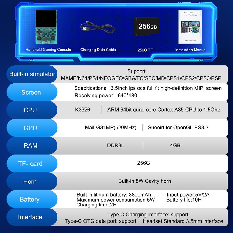 - 【Powerful Performance】 1.5GHz 64-bit RK3326 processor, Mali-G31MP dual-core GPU, and 8GB RAM; the new operating system offers a smoother and more responsive experience. Pre-installed with over 15,000 games, it supports more than 12 mainstream emulators, and the 256GB expandable memory allows for adding even more games.