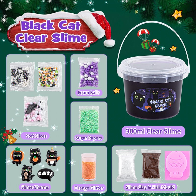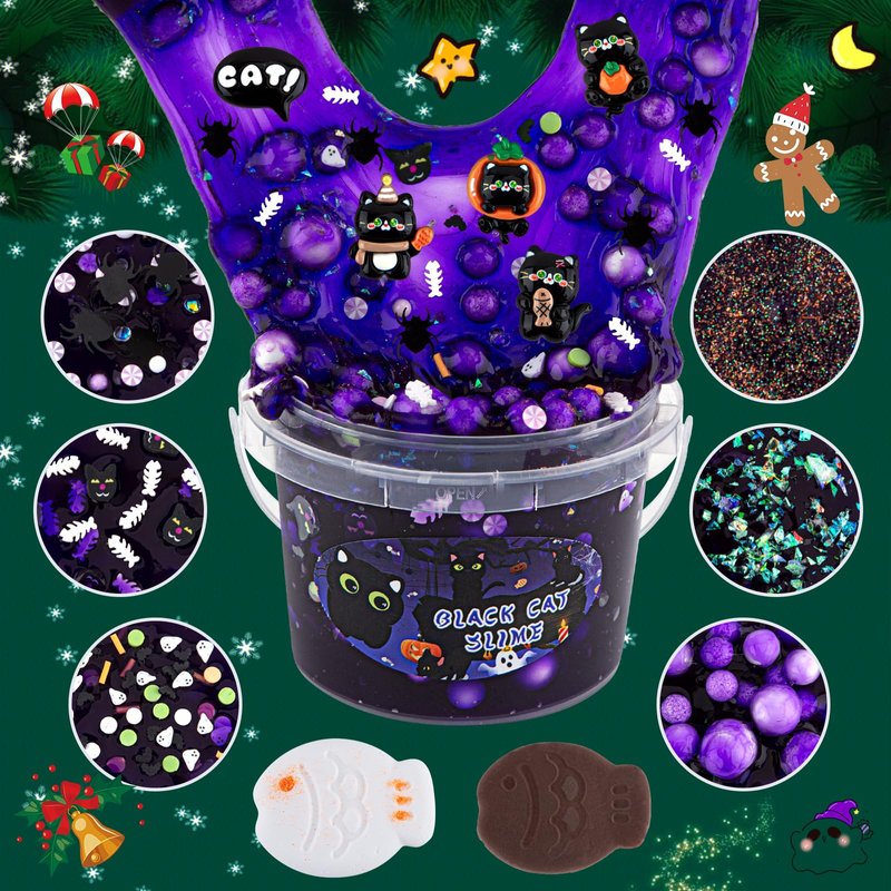 • 🐈‍⬛【Black Cat Slime Kit】Our kids slime kit includes 300ml dark purple clear slime and 8 packs slime add-ins and 5 cute cat slime charms. Create your own unique slime creations with this clear slime set featuring a black cat with a variety of adorable Halloween slime charms and rich soft slices.