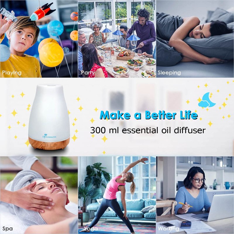 - 【Perfect Gift Idea】300ml Aromatherapy essential oil diffuser, cool mist humidifier, night light. Perfect gift for family and friends. Great ideal for home, office desk, bedroom, yoga studios, SPA, office, et.
