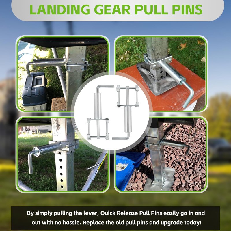 - 【Upgrade Spring-Loaded Design】 The heavy-duty spring loaded landing gear pull pin allows for quick height adjustment and secure hook-ups on your fifth wheel trailer jacks. This fifth wheel gear pull pin will remain attached to your jack so that when you need to raise or lower your jack, you can simply pull on the pin there to adjust the landing gear/front jacks to the desired height.