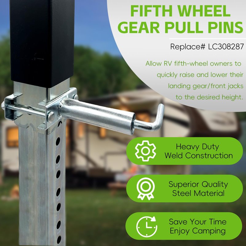 - 【Quick Height Adjustment】 The fifth wheel landing gear quick release pull pins are designed for fifth-wheel RV landing gear jacks. Allows for quick height adjustment of landing gear legs. This RV 5th wheel landing gear pull pin features standard 3/8" diameter pin fits 7/16" hole .Works with all type of jacks. Fits 2-1/4" square tube legs. (Replace# LC308287).
