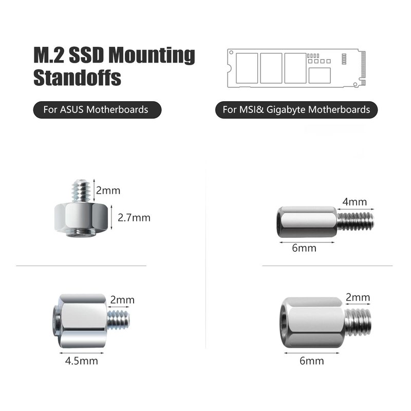 - Total 6 different m.2 standoff and screw for ssd mounting with 40 pcs, offering a 99% fit in all types of ASUS ASRock Gigabyte MSI motherboard. M.2 screw kit for M.2 slot on ASUS ASRock Gigabyte & MSI motherboards.