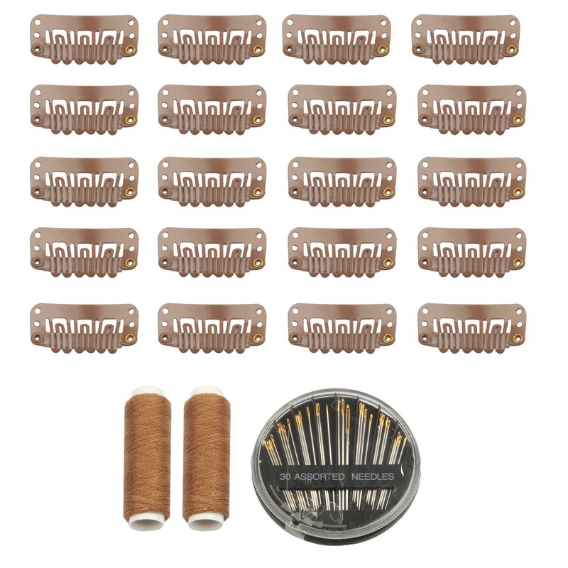 30pcs Hair Extension Clips U-Shape Stainless Steel Snap Clips for Wigs and Hair Extensions and Hairpieces, 30 Assorted Sewing Needles and 2 Rolls Thread (Light Brown)
