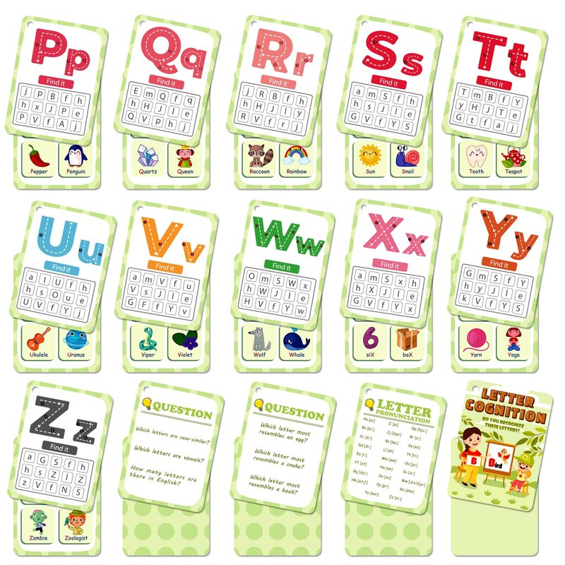 - DEVELOP MEMORY AND LANGUAGE SKILLS: Matching the reusable letter cognition flash cards, It can strengthen children's cognition of the upper and lower case of 26 English letters. Each alphabetic flashcard contains four words about that letter on the back,which aids in vocabulary building and memory as kids learn.