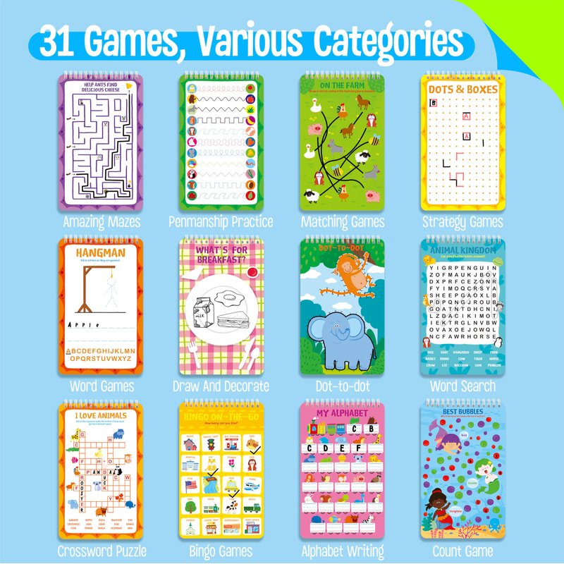 31 Reusable Activities: Our dry erase activity book is double-sided printed, including 31 fun games, such as MAZE, CONNECTING, MATCHING, TIC-TAC-TOE, DOT TO DOT, CATEGORIES, FIND WORDS, ALPHABET, BINGO GAME and so on. You can get these diverting games once for all in 1 pad. Different game choices wait for you and your children, allowing you to enjoy hours of fun while bored.