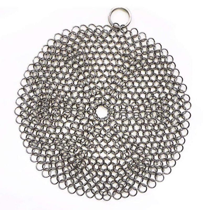 Cast Iron Cleaner 7 Inch Diameter Round Stainless Steel 316 Chainmail Scrubber for Cast Iron Cookware. WORKS LIKE A CHARM ON STAINLESS STEEL COOKWARE ENAMELED CAST IRON, AND MORE..The diameter 7 inch Chainmail Scrubber makes fast work of tough cleanup jobs on just about all the pots and pans in the kitchen, including stainless steel, enameled cast iron, hard anodized, copper and glass.SAVE YOUR HARD EARNED CAST IRON PAN SEASONING You work hard to get your cast iron pans perfectly seasoned. Don't risk losing your pan seasoning with detergents or scraping your pans with metal utensils. FAST Just run your pan under warm water and scrub. Cooked on residue will release quickly and easily. The best time to clean cast iron pans is shortly after cooking when they are just warm to the touch. CLEAN Cleans up fast with a little soapy water or just toss it in the dishwasher. EASY The toughest mess will clean up easy - even after cooking pork chops and leaving the pan overnight. we know, it happens at our house all the time! Customers love the big corner ring. It helps the hold while your cleaning and then just hang the scrubber to air dry.