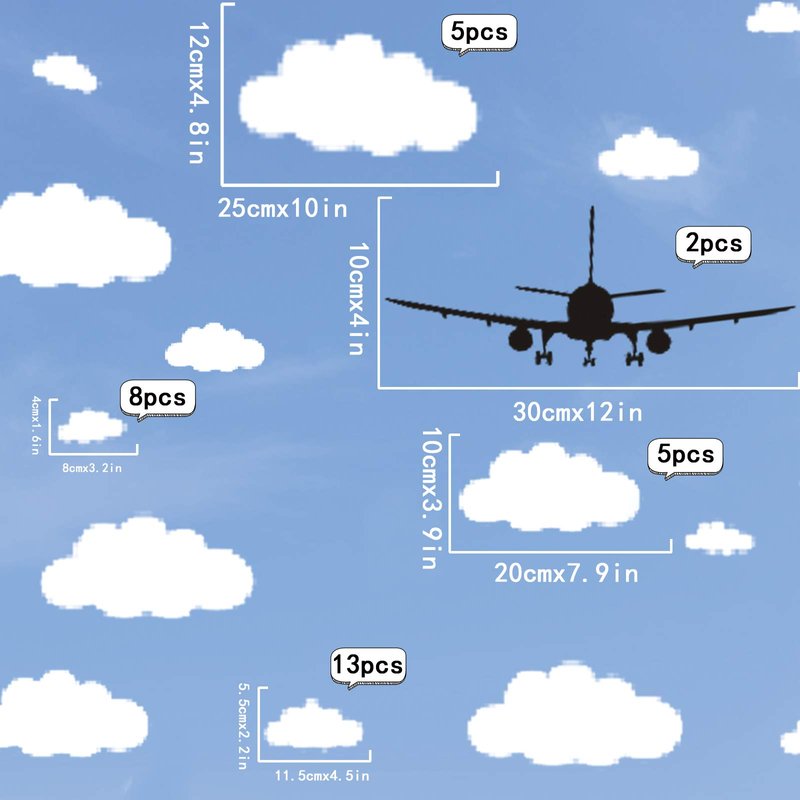 - Value Package: Set of 31 pcs white clouds stickers & 2 pcs black airplanes decals.
