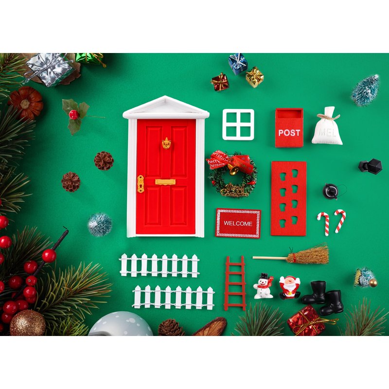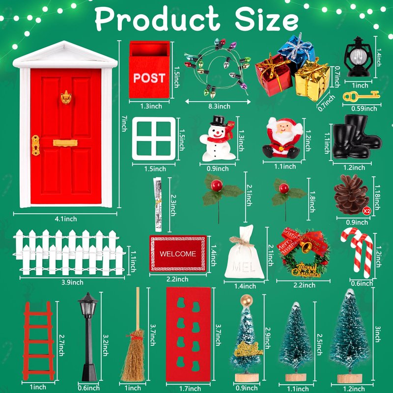 - Package includes:You will receive 1 red fairy door, 1 Christmas wreath, 1 mailbox, 2 white fences, 3 Christmas gift boxes, 2 LED light strips, 1 window, a pair of boots, 2 candy sticks, 1 oil lamp, 1 ladder, 1 carpet, 1 mini flour bag , 3 Christmas trees, 1 key, 1 snowman, 1 broom, 1 Santa Claus, 1 footprint floor mat, 1 lantern, 1 newspaper, 2 pine cones, and 2 berry cuttings