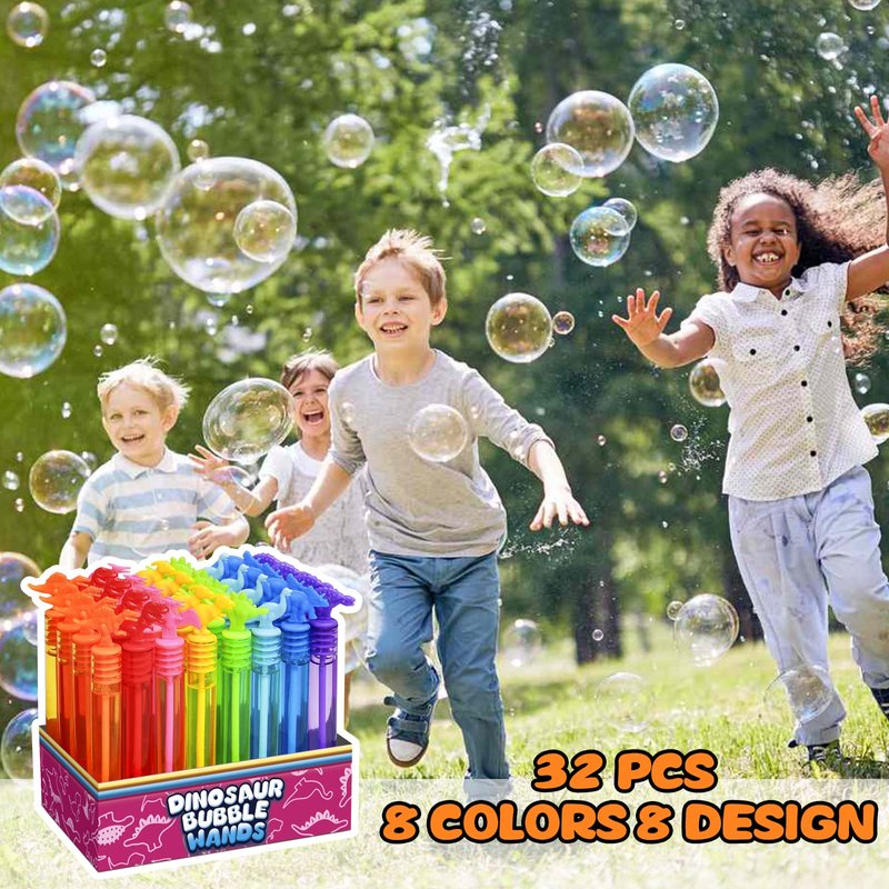 - Value with gift box - Including 32 PCS with 8 Style mini dinosaurs bubbles with specially design, Fun toy for summer and bath time activities. Children can easily blow out colored bubbles in the sun.