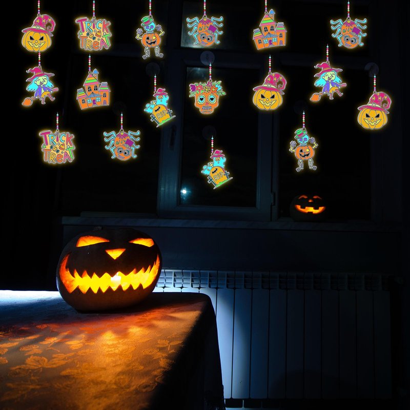 - Complete Halloween Art Creation Activities Set: the set includes 32 Halloween window stickers, 2 sets of six color liquid luminescent pigment, a pack of 200 acrylic beads, 32 clear sticky hooks, and a roll of cord; Create interesting scenes for your Halloween festivities