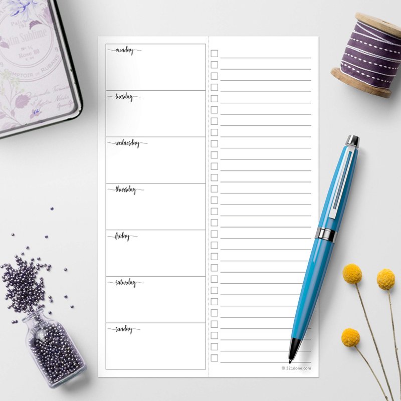 So convenient, so many uses, so great for getting you organized, this convenient notepad is a weekly planner and checklist in one! Each pad is a spacious 5 1/2 x 8 1/2 inches and contains 50 heavyweight sheets attached to a sturdy chipboard backing. Sheets are perforated right down the middle so you can plan using the days of the week boxes on the left, make a to-do list on the right, then tear it off and take it to go. This notepad is great for home, school, or the office. Jot down daily and weekly to-dos, goals, chores, appointments, work tasks, or priorities, or use it as a meal planning notepad. Plan your weekly menu on the left and write your grocery list on the right for simplified meal prep. 321Done offers a large collection of daily and weekly planners, trackers, to do lists, notepads, recipe cards, and more to help you get things done. See it all at amazon.com/321done.