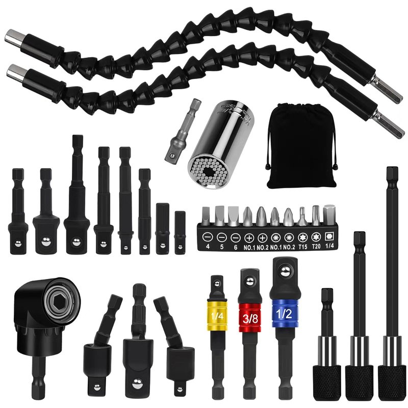 32pcs Flexible Drill Bit Extension Set, 105° Right Angle Drill Attachmen, Rotatable Joint Socket 1/4 3/8 1/2 In Hex Socket Adapter, Bendable Drill Bit Extension Screwdriver Bit
