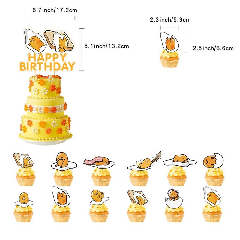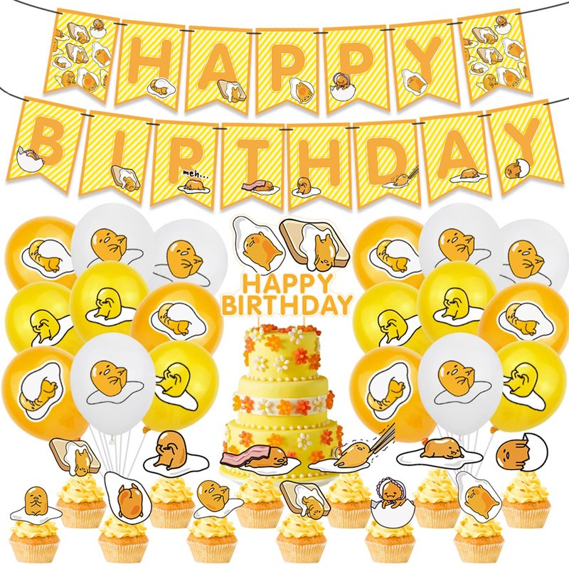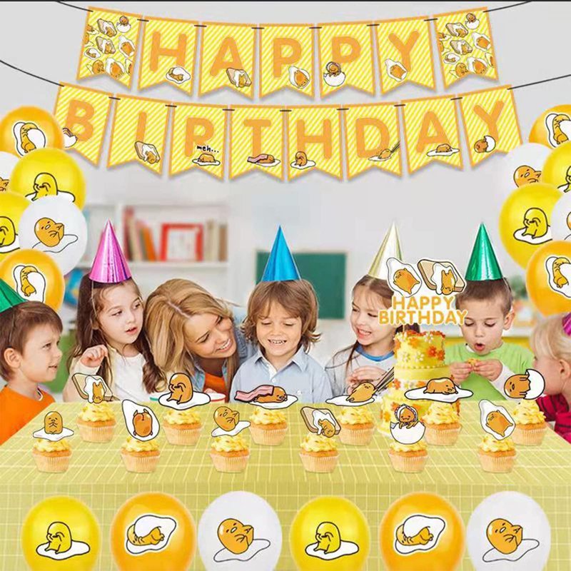 - Complete birthday decoration kit:Gudetama birthday party supplies include a set of "happy birthday" letter banner featuring the characters of "Gudetama" ,18Gudetama theme balloons,1Gudetama cake topper,12Gudetama cupcake toppers.