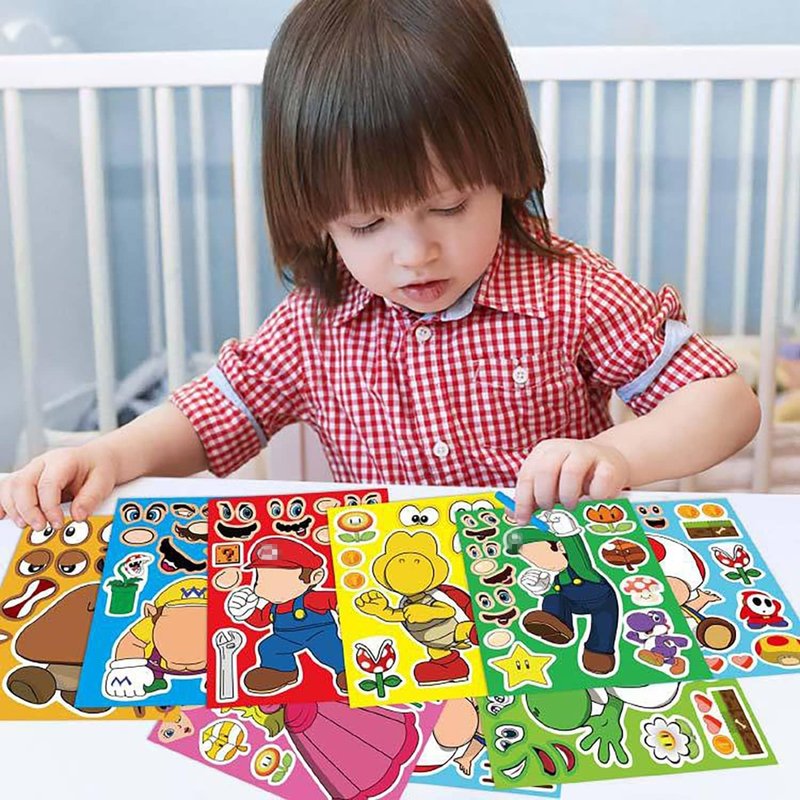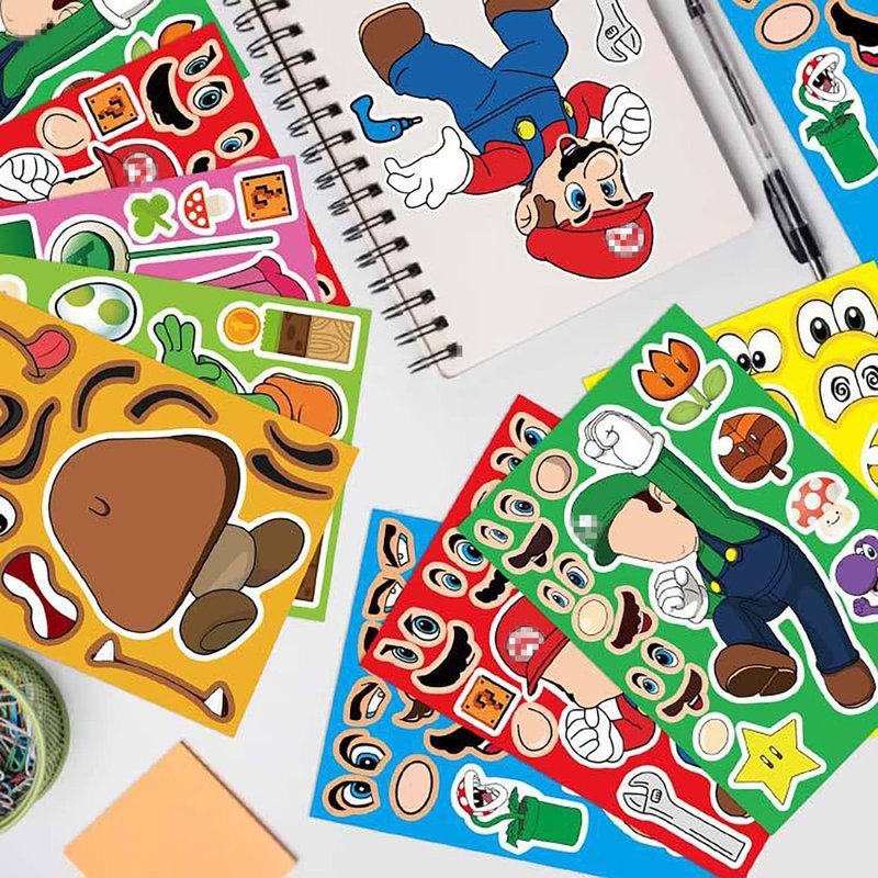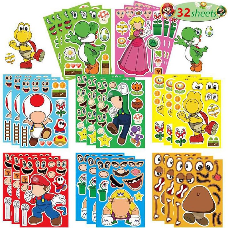 32Pcs Mario Make a Face Stickers, Cartoon Book Crafts for Kids, DIY Party Supplies Favors Your Own Mixed and Matched with Different Designs Characters Birthday Gifts Class Reward Decor