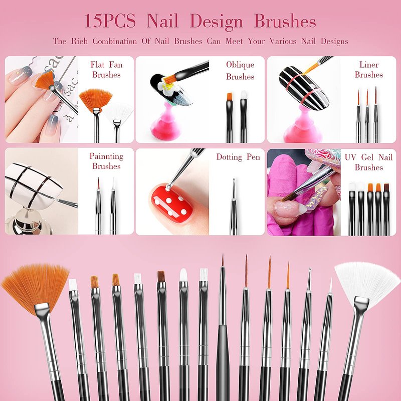 - 1.【MULTIFUNCTIONAL NAIL ART BRUSH SET】 : The Nail Art Brush Set Is A Total Of 32 Pieces, Including 15 Nail Art Design Brushes, 5 Colorful Double-Ended Nail Point Tools, 5 Acrylic Nail Brushes, 3 Nail Line Brushes, 3 Double End Nail Art Brushes And 1 Dusting Brush, A Rich Combination Of Nail Brushes Can Meet Your Various Nail Designs.