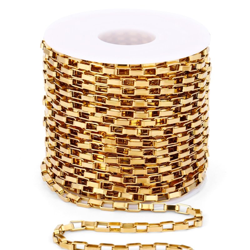 33 Feet 18K Gold PVD Plated Stainless Steel Box Chains Bulk, 3mm 304 Stainless Steel Chain Spool Square Link Box Chain Roll Bulk for Jewelry Making