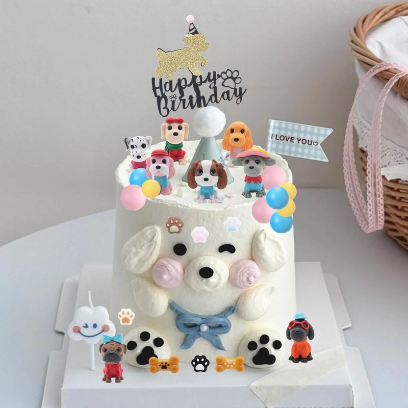 - What you will receive:8 X dog cake toppers. 15 X Ball Cake Decorations(pink blue yellow).4 X cute puppies .5 X dog footprint accessories .1 X “Happy birthday”cake topper.This puppy birthday set was made by hand painted with high realistically detailed appearance.