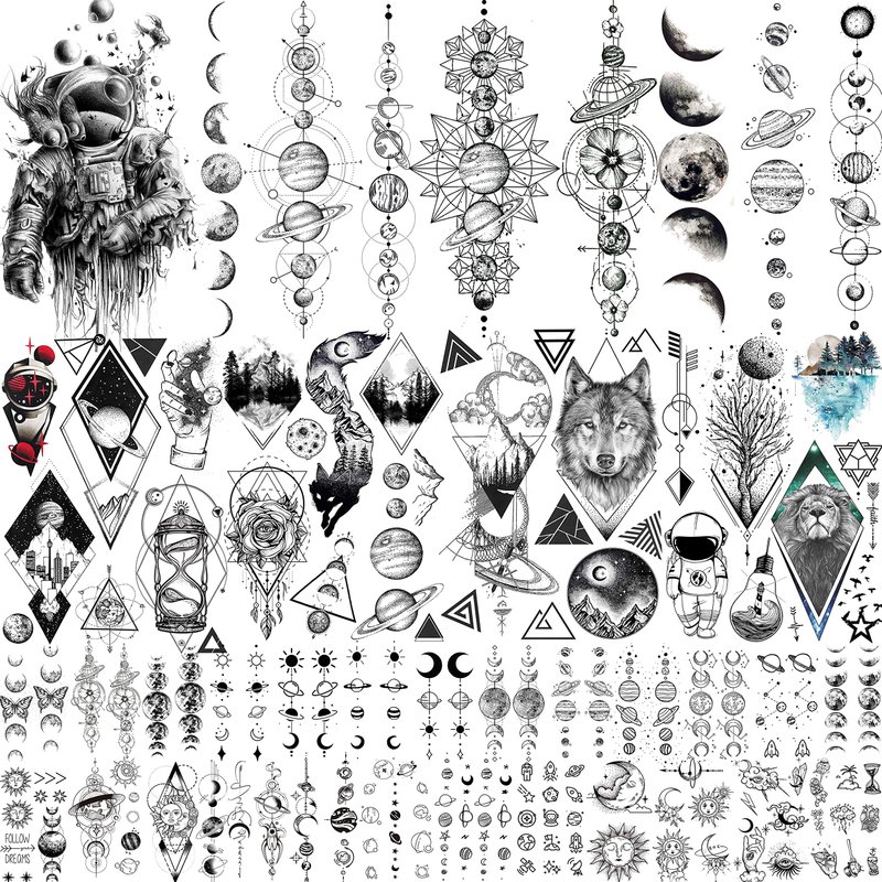 - 🌟33 Sheets Variety Designs -- JOEHAPY Brand Temporary Tattoos For Kids Women Men Adults. One Package Includes 8 Sheets HOT Custom Large Geometric Planets Temporary Tattoos For Women and 25 Sheets Small Black Temporary Tattoos For Men Star Wolf Lion Gothic Moon Sun Cute Outer Space Universe Abstract illustration Cosmos Astronaut Galaxy Triangle Pine Tree City Satellite Solar System Line Art Feather Mountain Geometry Bracelet Forearm Temporary Tatoos Paper.
