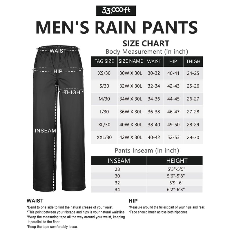 - Humanized Design: 33,000ft rain pants is fully elasticated waistband with drawstring inside, it helps you customize your fit around waist. The two zipped pockets with flip, providing great privacy and convenience for you. It's also keeping mother nature's elements out.