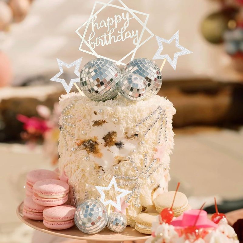 - 【Material】These disco balls cake decorations are made of high quality foam material and covered with mirrored facets. The happy birthday cake topper is made of acrylic and the star cake decorations are made of quality paper and bamboo material, They are safe and non-toxic.
