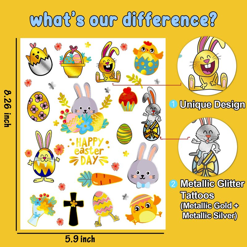 - 【Metallic Glitter Decorations for Easter Day】2 Sheets with 34 metallic+metallic silver Easter tattoos make you shine and unique in Easter Day! Super cute patterns include Easter eggs, chick, flower and other elements that kids will like.