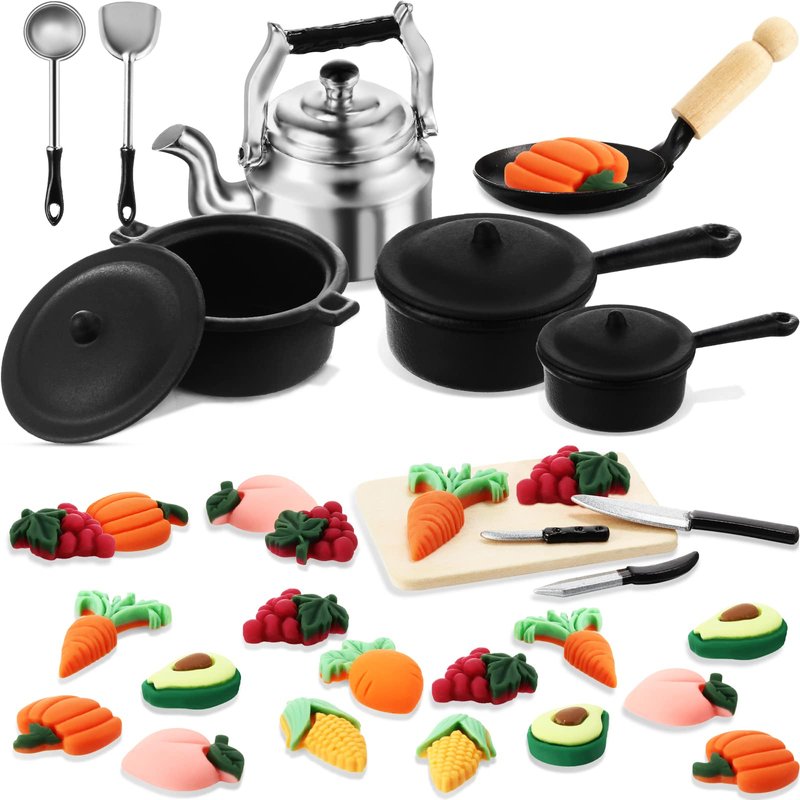 - Package includes: you will get 34 pieces of dollhouse miniature kitchen cooking accessories and mini simulation vegetable and fruit set, including black pots with lids, pan, chopping board and mini simulation knives, soup spoon, cooking spatula, kettle and mini fruits and vegetables, rich in variety and sufficient quantity to meet your needs on pretend play