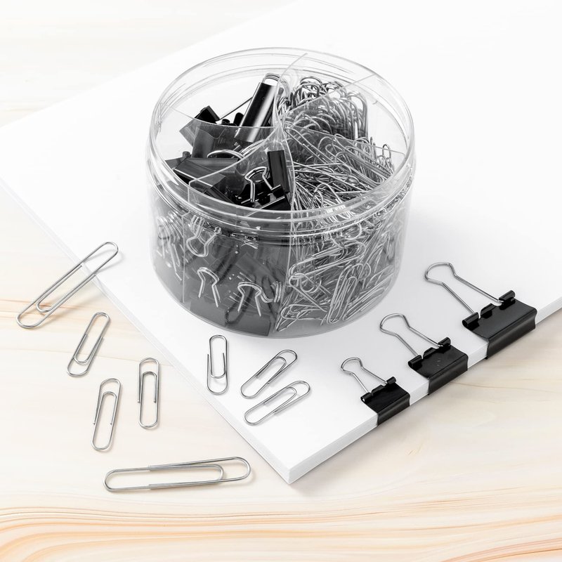 - 【Easy storage】 Large paper clips, medium paper clips, small paper clips, medium binder clips, small binder clips and mini binder clips lie in a plastic container with 6 separated compartments for each size. Easy access and keep your desk and drawer neat